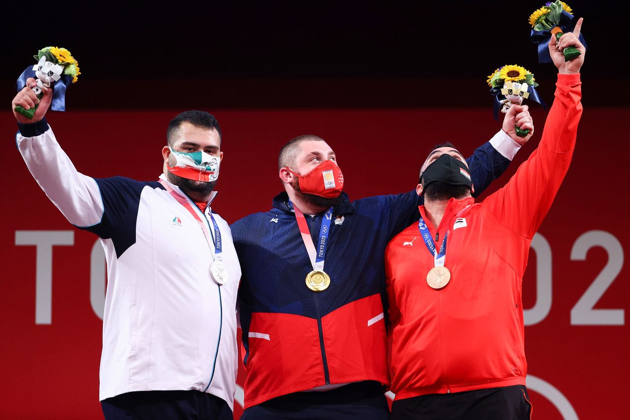 Tokyo 2020 Olympics - Weightlifting - Men's +109kg - Medal Ceremony - Tokyo International Forum, Tokyo, Japan - August 4, 2021. Gold medalist Lasha Talakhadze of Georgia, silver medalist Ali Davoudi of Iran and bronze medalist Man Asaad of Syria react. REUTERS/Edgard Garrido