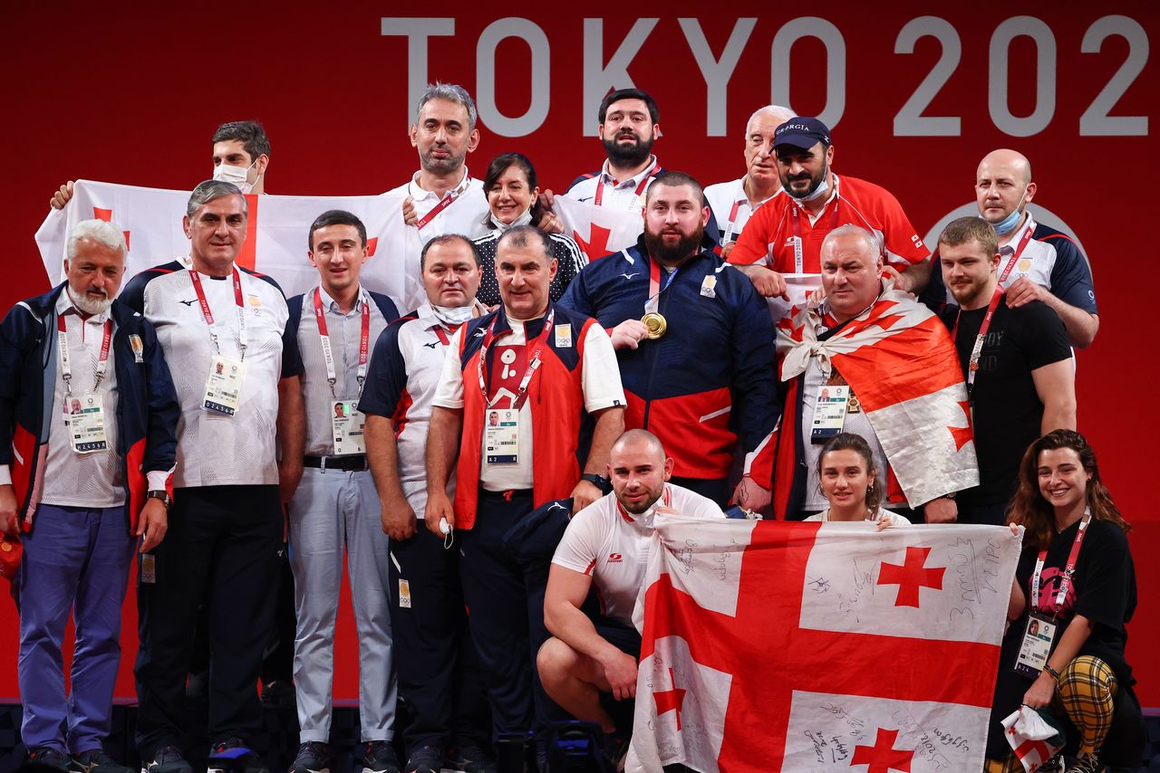 Tokyo 2020 Olympics - Weightlifting - Men's +109kg - Medal Ceremony - Tokyo International Forum, Tokyo, Japan - August 4, 2021. Gold medalist Lasha Talakhadze of Georgia poses with members of his team. REUTERS/Edgard Garrido