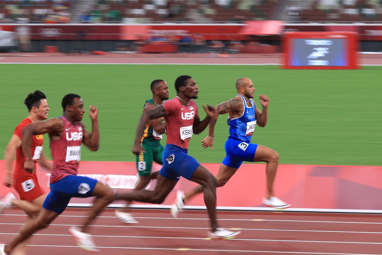 FILE PHOTO: Tokyo 2020 Olympics - Athletics - Men's 100m - Final - OLS - Olympic Stadium, Tokyo, Japan - August 1, 2021. Lamont Marcell Jacobs of Italy, Fred Kerley of the United States, Akani Simbine of South Africa, Ronnie Baker of the United States and Su Bingtian of China in action REUTERS/Hannah Mckay