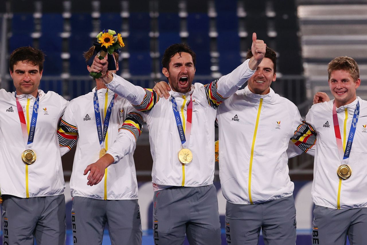 Tokyo 2020 Olympics - Hockey - Men - Medal Ceremony - Oi Hockey Stadium, Tokyo, Japan - August 5, 2021. Loick Luypaert of Belgium reacts as they pose for pictures after receiving their gold medals. REUTERS/Bernadett Szabo
