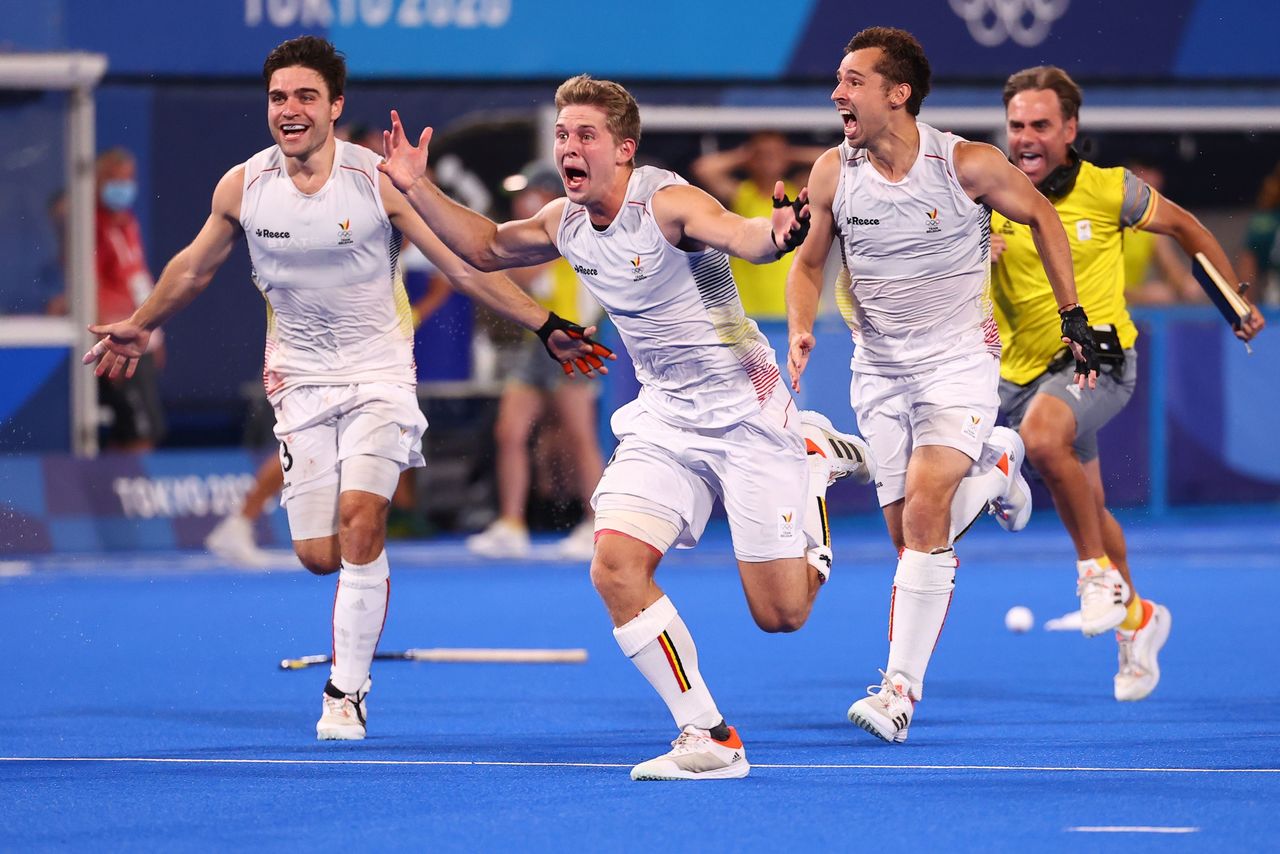 Tokyo 2020 Olympics - Hockey - Men - Gold medal match - Australia v Belgium - Oi Hockey Stadium, Tokyo, Japan - August 5, 2021. Players of Belgium celebrate after winning their penalty shoot-out. REUTERS/Bernadett Szabo