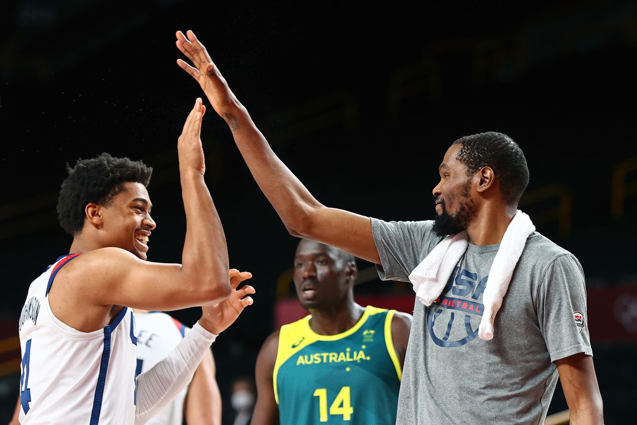 Tokyo 2020 Olympics - Basketball - Men - Semifinal - United States v Australia - Saitama Super Arena, Saitama, Japan - August 5, 2021. Kevin Durant of the United States and Keldon Johnson of the United States celebrate after the match REUTERS/Sergio Perez