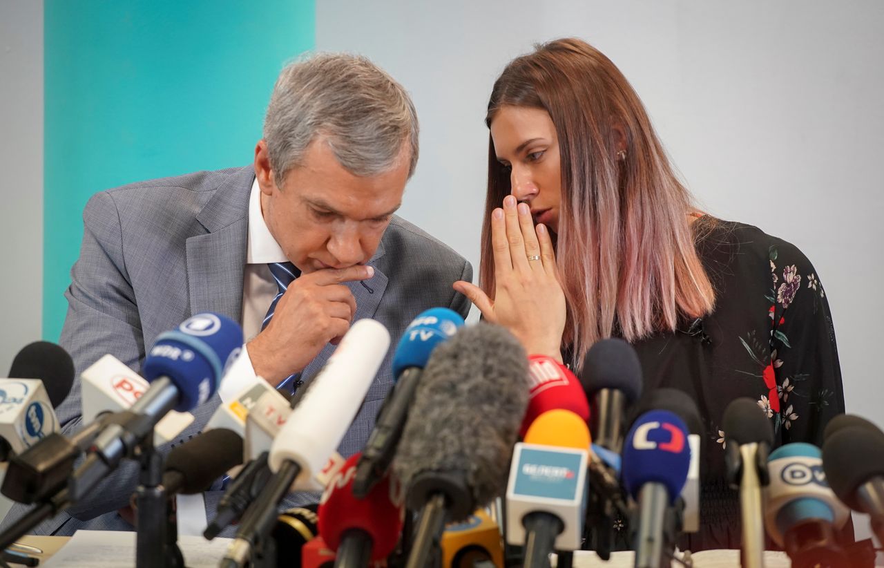 Belarusian sprinter Krystsina Tsimanouskaya, who left the Olympic Games in Tokyo and seeks asylum in Poland, and Belarusian opposition politician Pavel Latushka attend a news conference in Warsaw, Poland August 5, 2021. REUTERS/Darek Golik