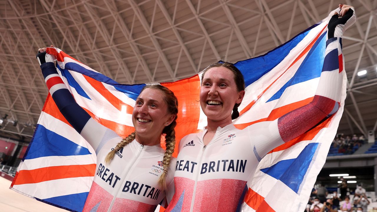 Tokyo 2020 Olympics - Cycling - Track - Women's Madison - Final - Izu Velodrome, Shizuoka, Japan - August 6, 2021. Laura Kenny of Britain and Katie Archibald of Britain celebrate winning gold. REUTERS/Kacper Pempel