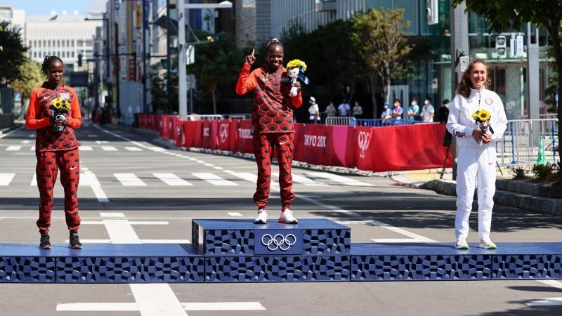Tokyo 2020 Olympics - Athletics - Women's Marathon - Flower ceremony - Sapporo Odori Park, Sapporo, Japan - August 7, 2021. Gold medallist Peres Jepchirchir of Kenya, silver medallist Brigid Kosgei of Kenya and bronze medallist Molly Seidel of the United States pose on the podium REUTERS/Feline Lim