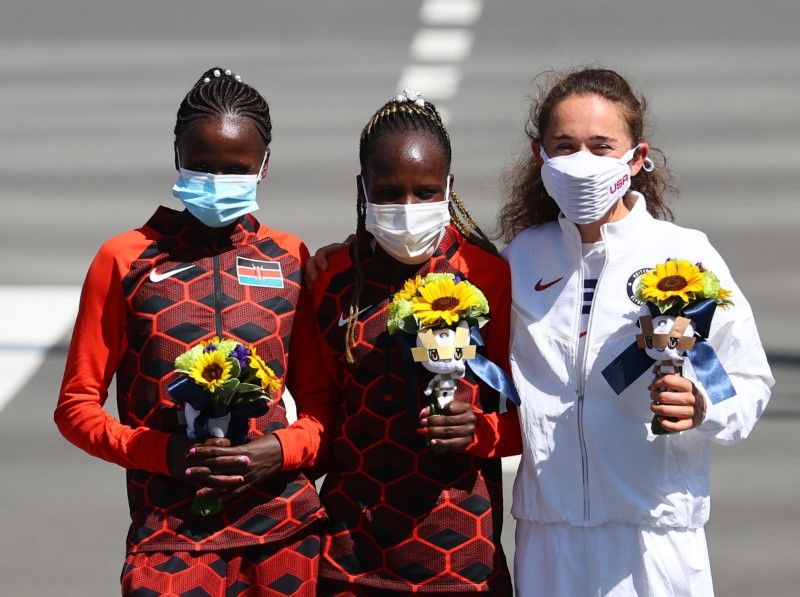 Tokyo 2020 Olympics - Athletics - Women's Marathon - Flower ceremony - Sapporo Odori Park, Sapporo, Japan - August 7, 2021. Gold medallist Peres Jepchirchir of Kenya, silver medallist Brigid Kosgei of Kenya and bronze medallist Molly Seidel of the United States pose REUTERS/Kim Hong-Ji