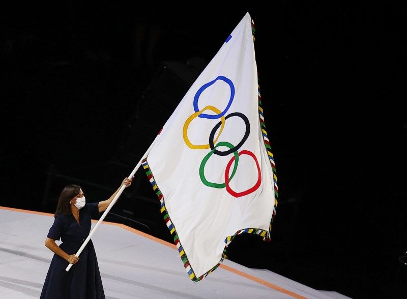 Tokyo 2020 Olympics - The Tokyo 2020 Olympics Closing Ceremony - Olympic Stadium, Tokyo, Japan - August 8, 2021. The Mayor of Paris, Anne Hidalgo, waves the Olympic flag during the closing ceremony REUTERS/Carlos Barria