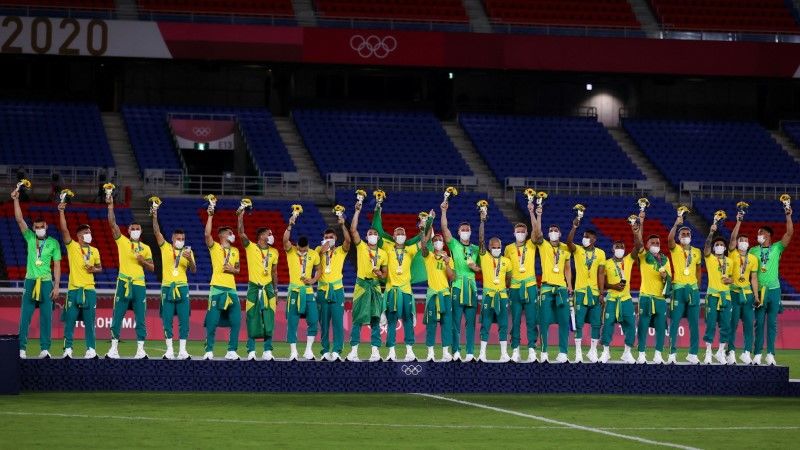 FILE PHOTO: Tokyo 2020 Olympics - Soccer Football - Men's Team - Medal Ceremony - International Stadium Yokohama, Yokohama, Japan - August 7, 2021. Gold medallists Brazil celebrate during the medal ceremony. REUTERS/Amr Abdallah Dalsh/File Photo