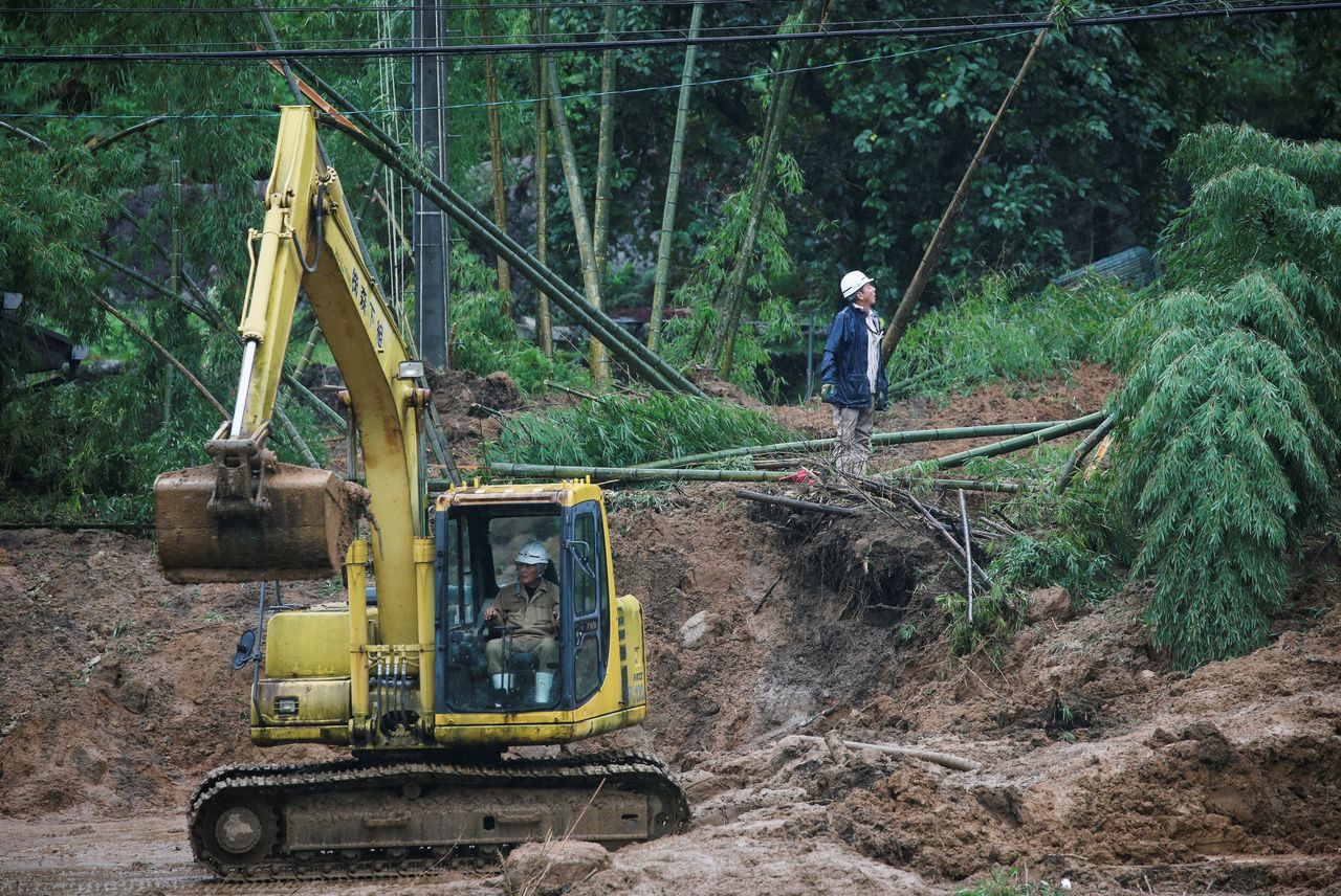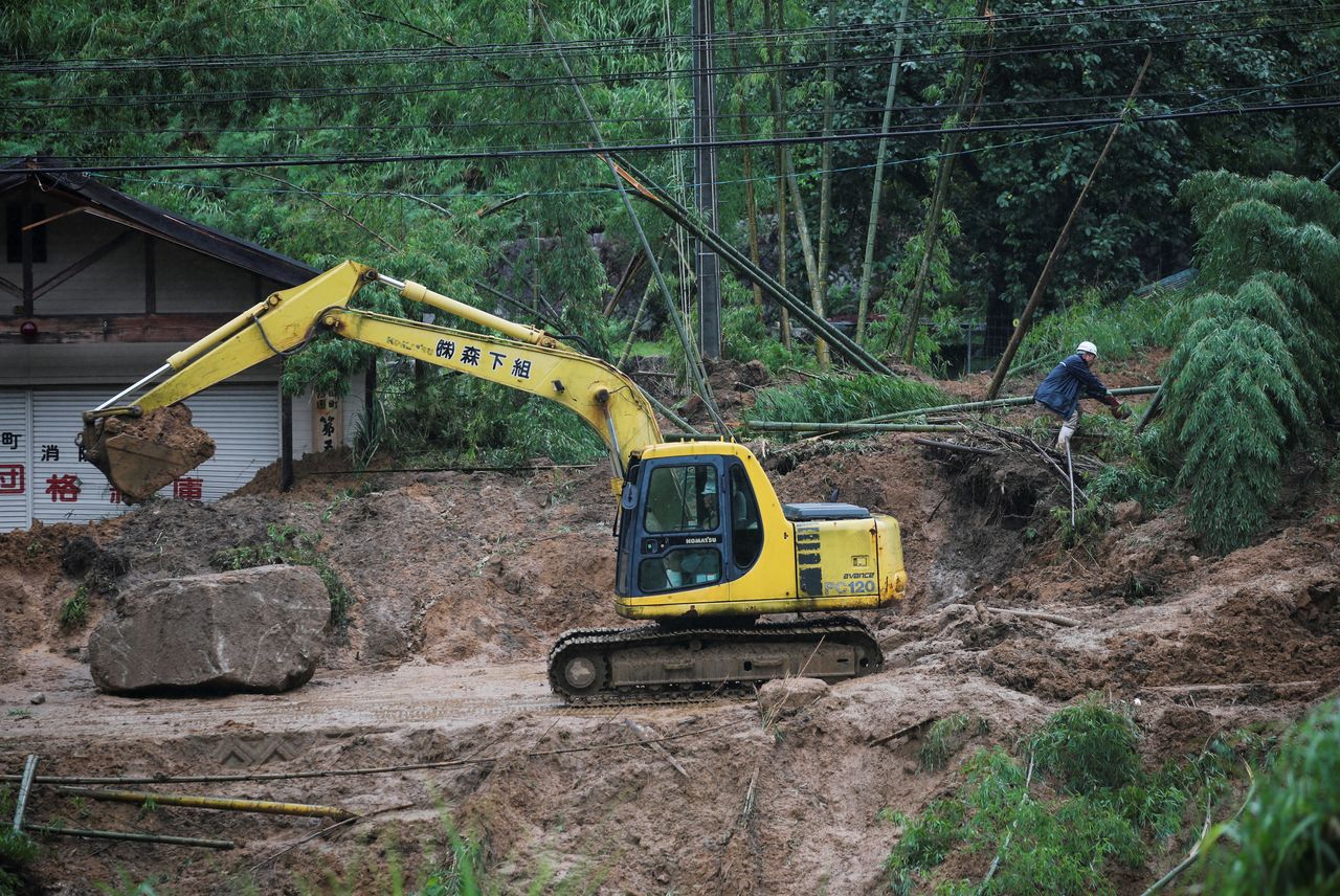 Workers clear a site where a landslide left a 75-year-old woman injured after heavy rain in Soeda, Fukuoka Prefecture, Japan August 16, 2021. REUTERS/Kim Kyung-Hoon