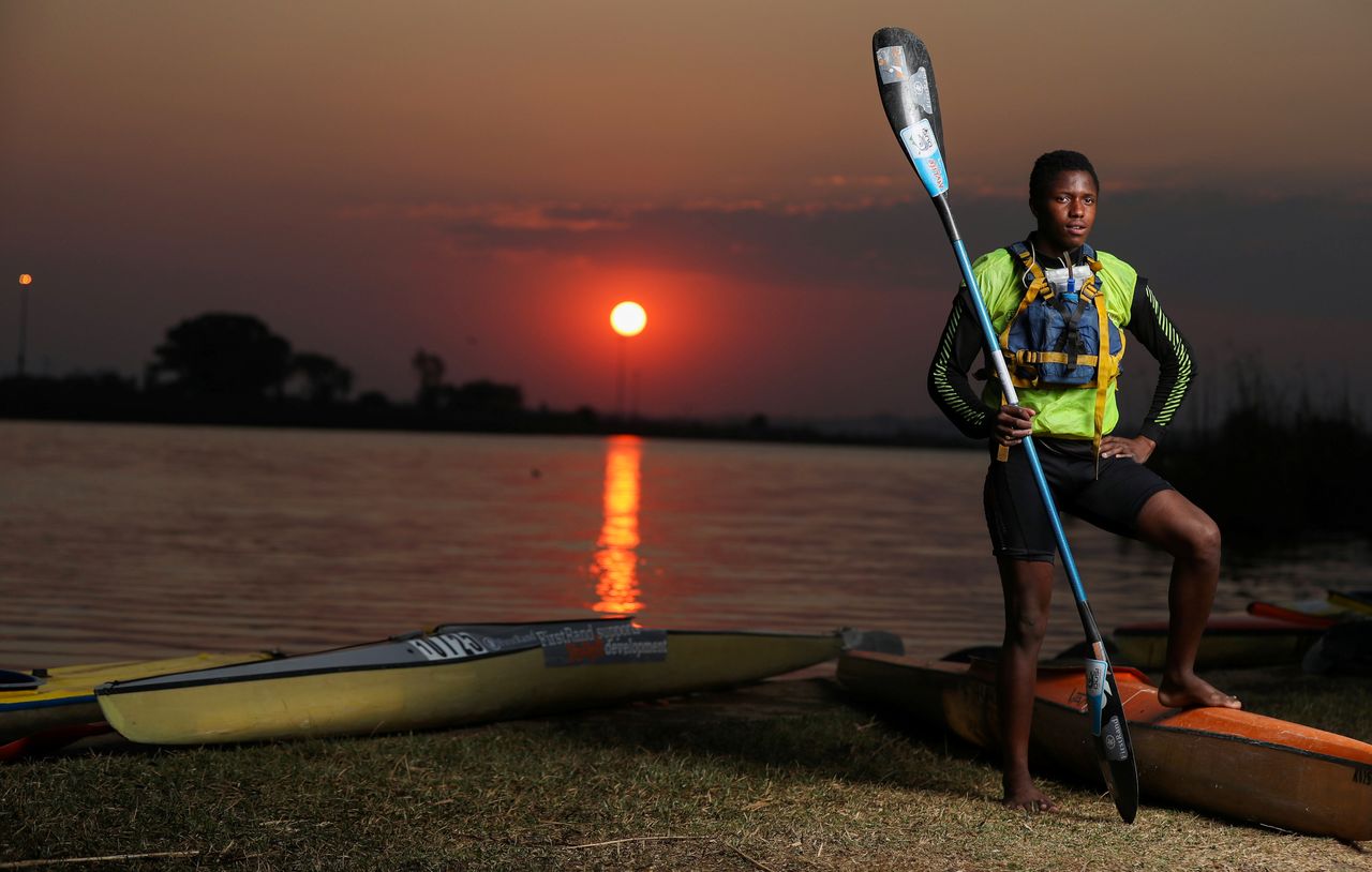 Twenty-year-old Benjamin Mntonintshi, a member of the Soweto Canoe and Recreation Club, poses for a photograph at the Orlando Dam in Soweto, South Africa, August 17, 2021. REUTERS/Siphiwe Sibeko