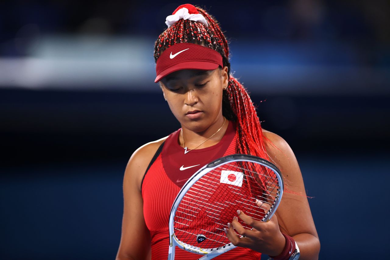FILE PHOTO: Tokyo 2020 Olympics - Tennis - Women's Singles - Round 3 - Ariake Tennis Park - Tokyo, Japan - July 27, 2021. Naomi Osaka of Japan reacts during her third round match against Marketa Vondrousova of Czech Republic REUTERS/Edgar Su