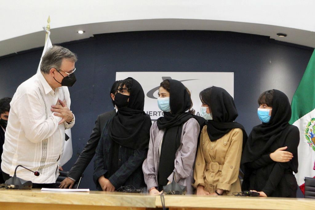 Mexico's Foreign Minister Marcelo Ebrard welcomes members of Afghanistan's robotics team after arriving in Mexico to apply for humanitarian status, at the Benito Juarez International airport in Mexico City, Mexico August 24, 2021. Mexico's Foreign Relations Ministry/Handout via REUTERS