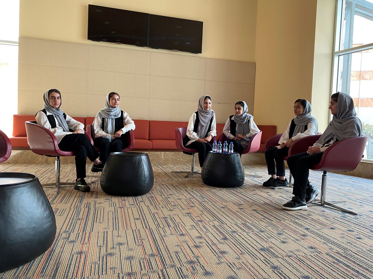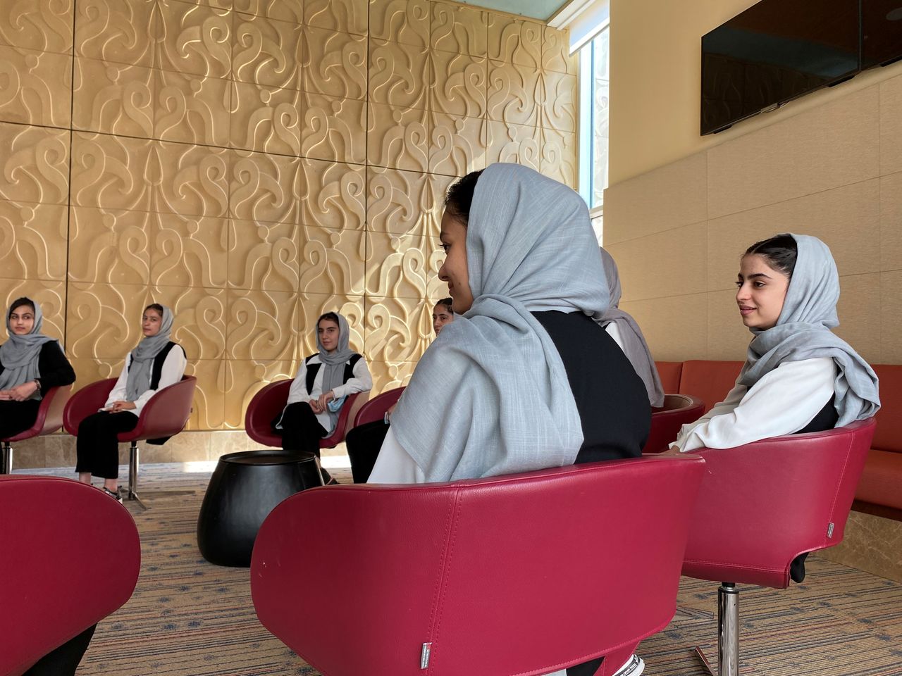 Members of an Afghan all-girls robotics team who were evacuated last week from Afghanistan speak to each other in Doha, Qatar August 25, 2021. REUTERS/Alexander Cornwell
