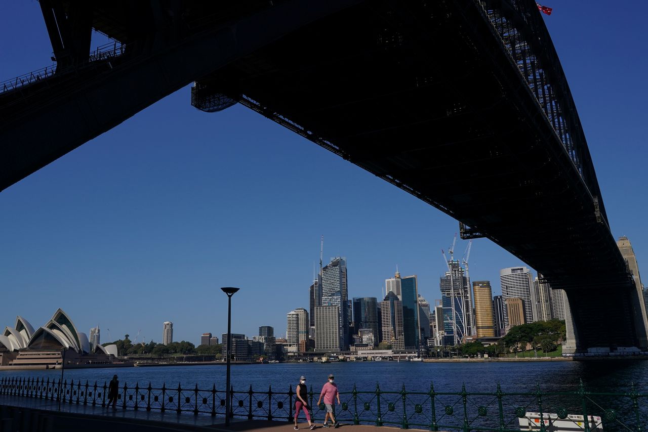 People in protective face masks walk under the Sydney Harbour Bridge during a lockdown to curb the spread of a coronavirus disease (COVID-19) outbreak in Sydney, Australia, September 3, 2021. REUTERS/Loren Elliott