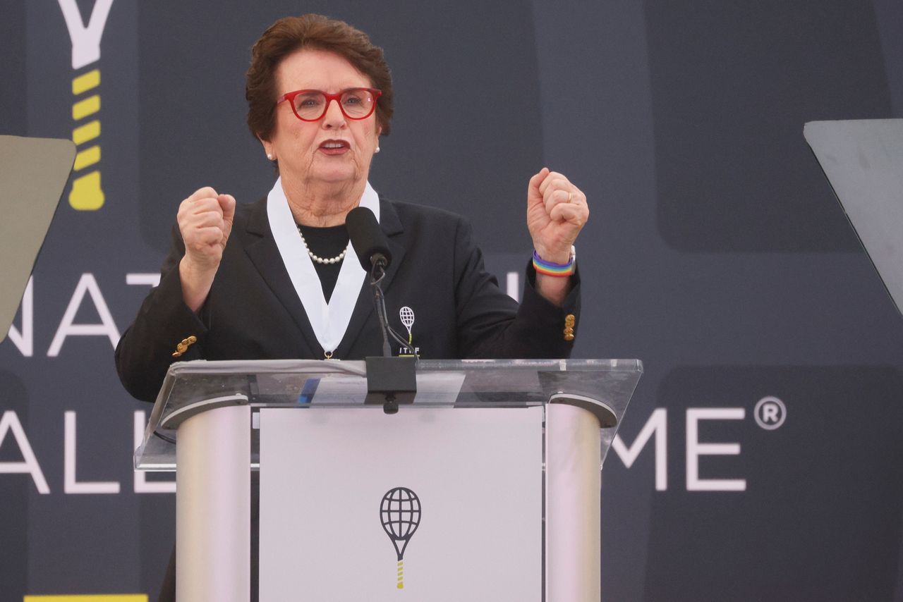 FILE PHOTO: Former tennis player Billie Jean King speaks as she is inducted for the second time into the International Tennis Hall of Fame, this time as a member of the Original 9, in Newport, Rhode Island, U.S., July 17, 2021. REUTERS/Brian Snyder