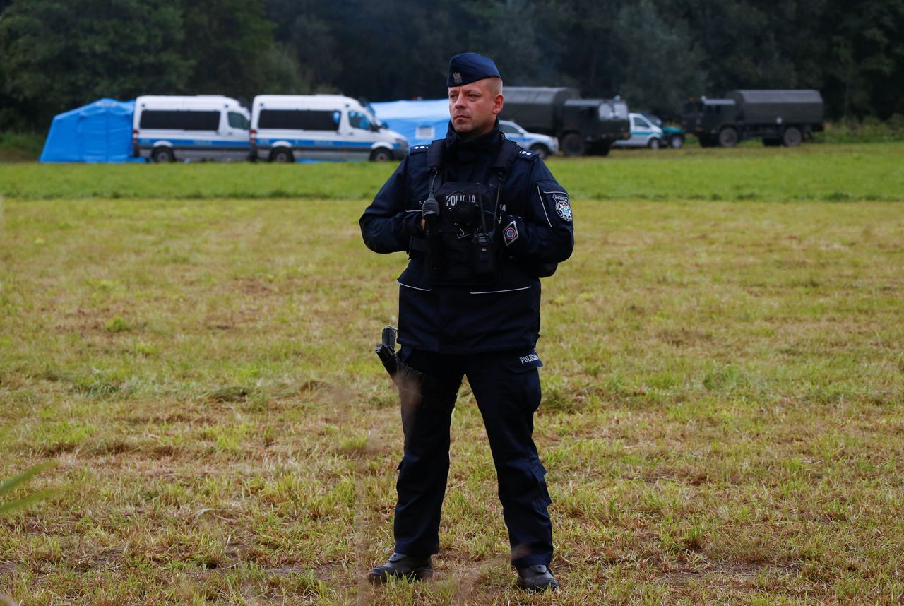 FILE PHOTO: Polish police officer stands guard next to a group of migrants stranded on the border between Belarus and Poland near the village of Usnarz Gorny, Poland August 26, 2021. REUTERS/Kacper Pempel