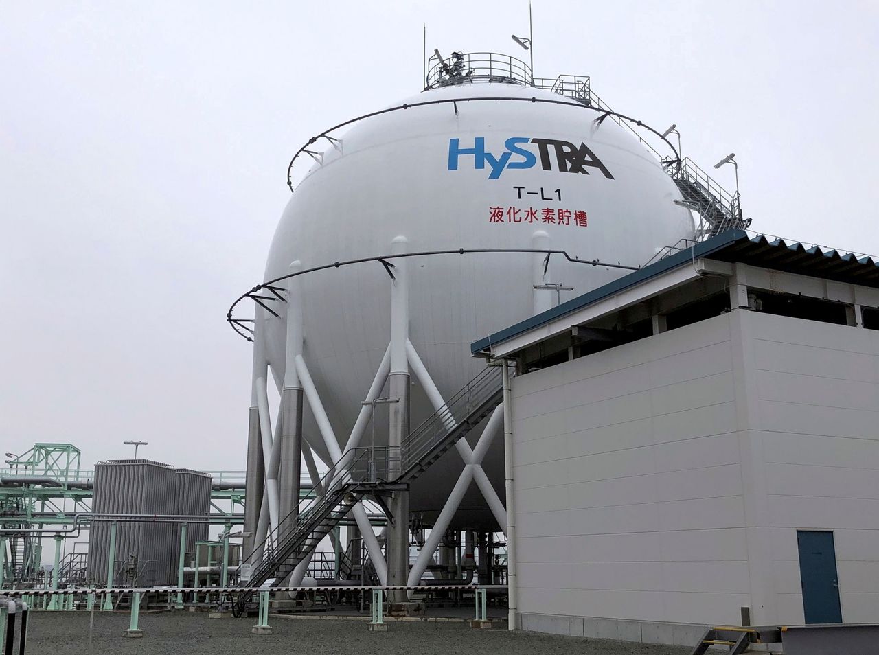 FILE PHOTO: The logo of the CO2-free Hydrogen Energy Supply-chain Technology Research Association (HySTRA) is seen on a liquefied hydrogen storage tank built by Kawasaki Heavy Industries at the hydrogen receiving terminal at the Kobe Airport Island in Kobe, western Japan January 22, 2021. REUTERS/Yuka Obayashi