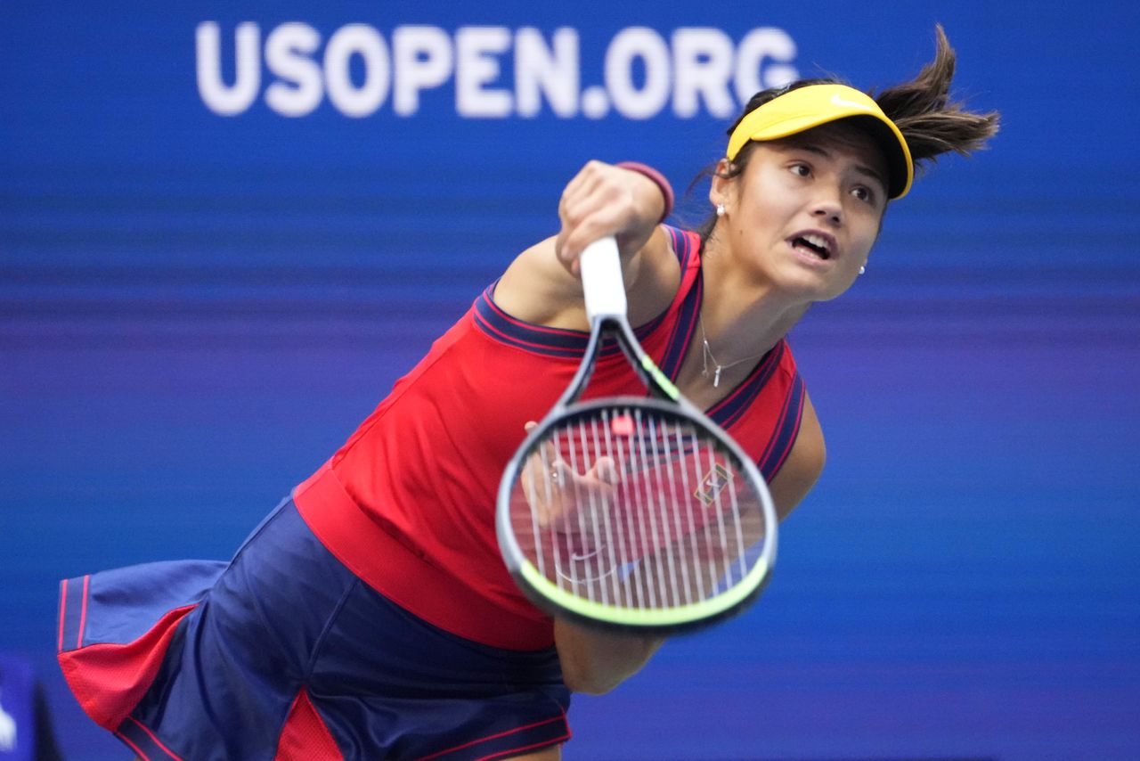 Sep 11, 2021; Flushing, NY, USA; Emma Raducanu of Great Britain serves against Leylah Fernandez of Canada (not pictured)in the women's singles final on day thirteen of the 2021 U.S. Open tennis tournament at USTA Billie Jean King National Tennis Center. Mandatory Credit: Robert Deutsch-USA TODAY Sports