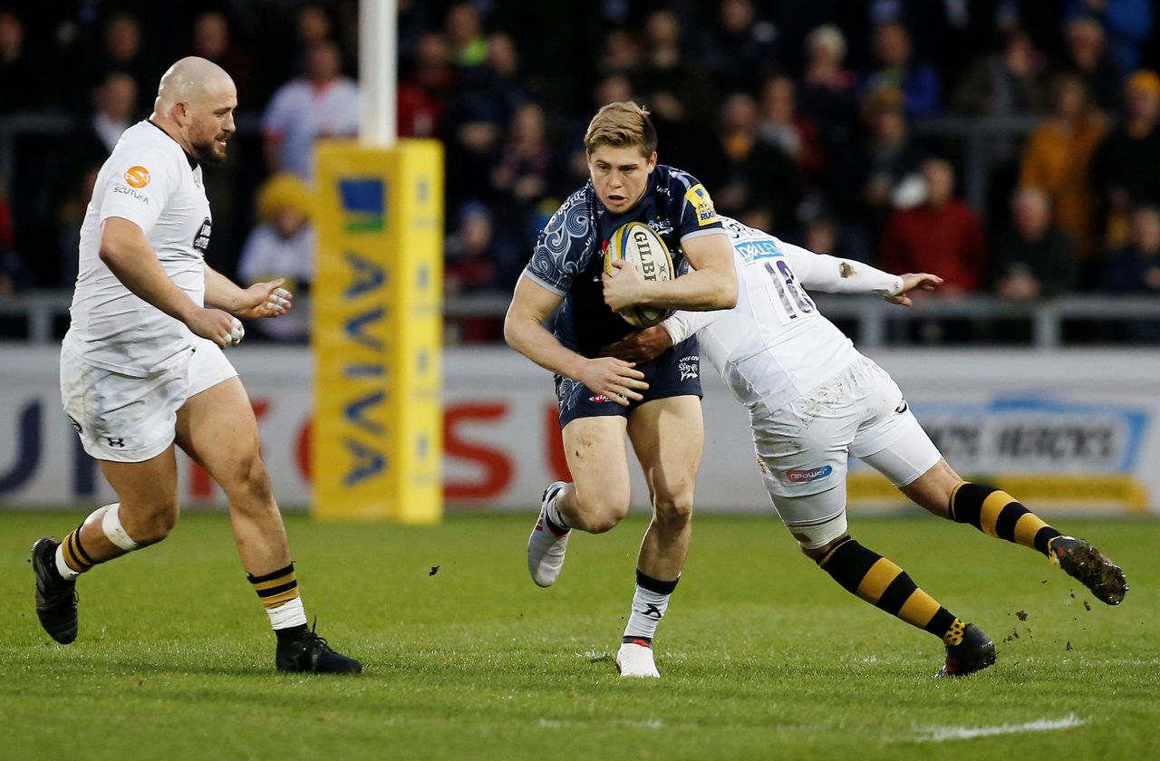 FILE PHOTO: Rugby Union - Premiership - Sale Sharks vs Wasps - AJ Bell Stadium, Sale, Britain - April 6, 2018 Sale Sharks' James O'Connor (C) in action with Wasps' Jake Cooper-Woolley (L) and Danny Cipriani Action Images/Craig Brough/File Photo