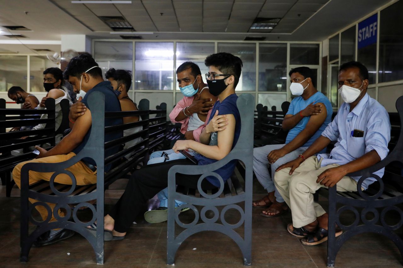People wait at the observation area after receiving a dose of COVISHIELD, a vaccine against coronavirus disease (COVID-19) manufactured by Serum Institute of India, at a hospital in Noida on the outskirts of New Delhi, India, August 30, 2021. REUTERS/Adnan Abidi