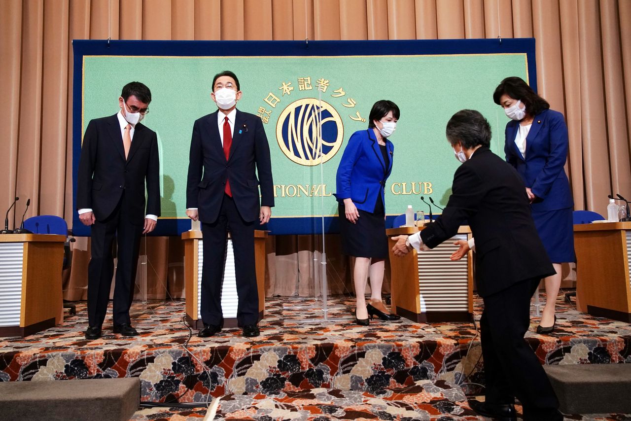 Candidates for the presidential election of the ruling Liberal Democratic Party attend a debate session held by Japan National Press Club September 18, 2021 in Tokyo, Japan. The contenders are (L to R) Taro Kono, the cabinet minister in charge of vaccinations, Fumio Kishida, former foreign minister, Sanae Takaichi, former internal affairs minister, and Seiko Noda, former internal affairs minister. Eugene Hoshiko/Pool via REUTERS