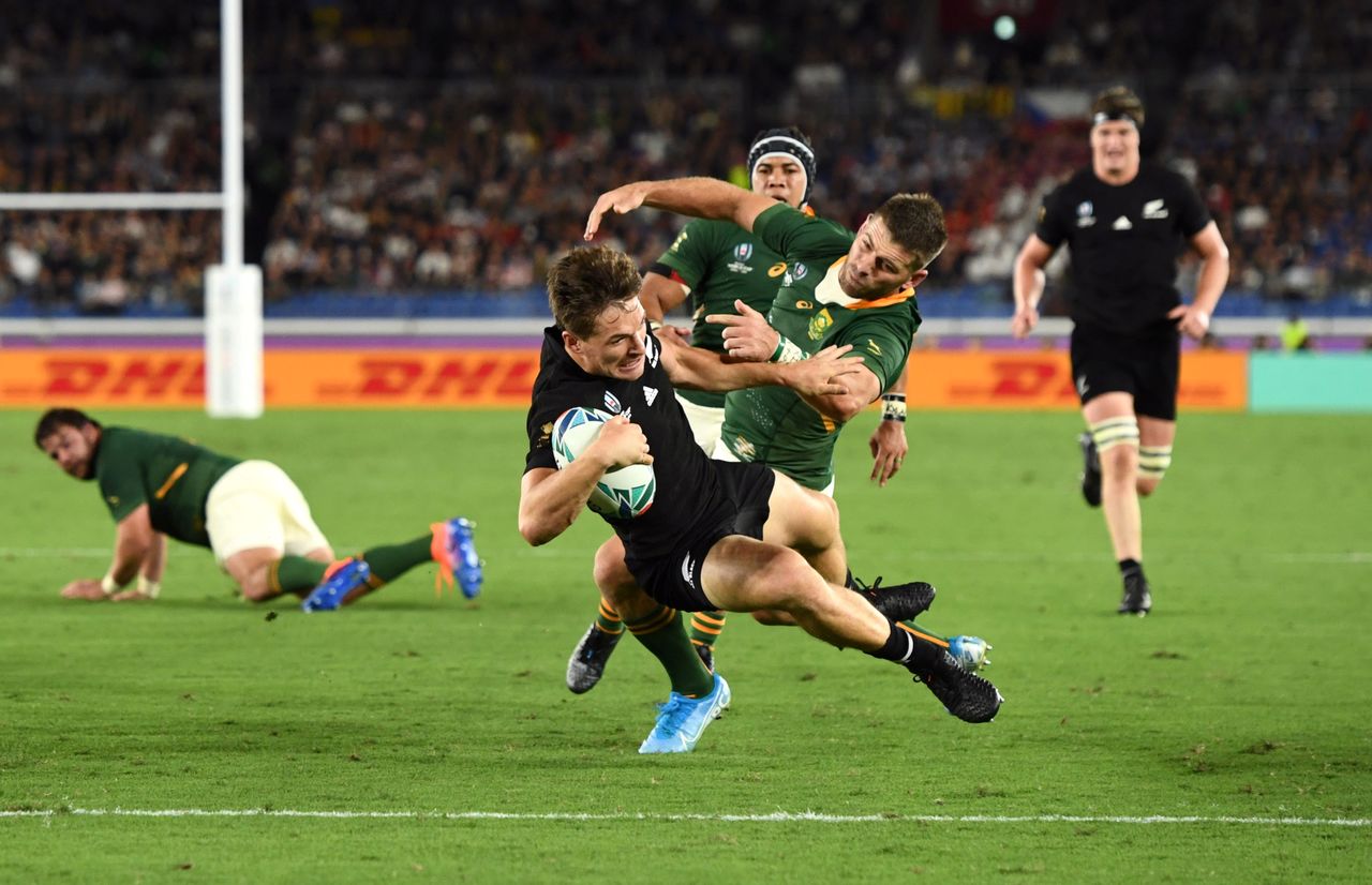 FILE PHOTO: Rugby Union - Rugby World Cup 2019 - Pool B - New Zealand v South Africa - International Stadium Yokohama, Yokohama, Japan - September 21, 2019 New Zealand's George Bridge scores their first try REUTERS/Annegret Hilse/File Photo