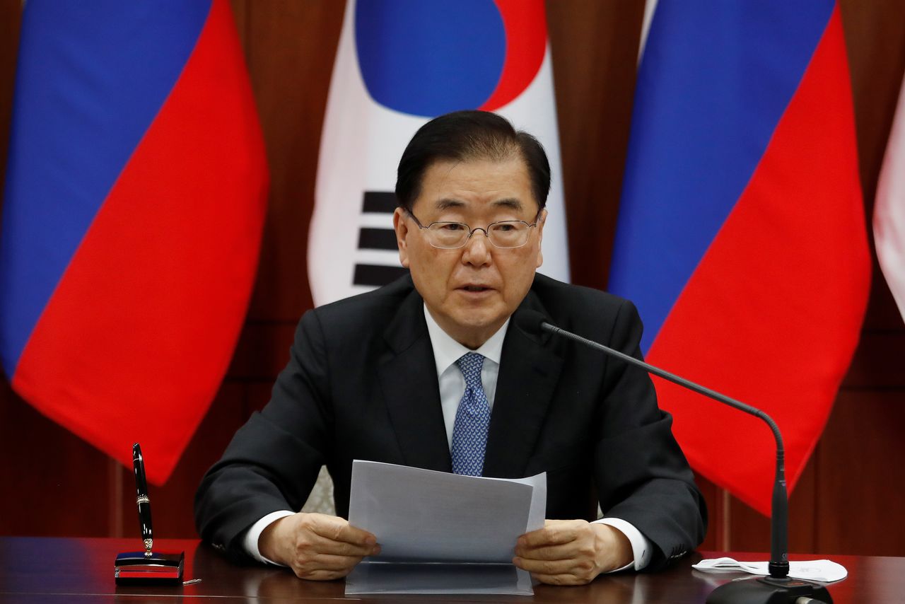 FILE PHOTO: South Korean Foreign Minister Chung Eui-yong speaks during a joint announcement with Russian Foreign Minister Sergei Lavrov at the Foreign Ministry in Seoul, South Korea, March 25, 2021. Ahn Young-joon/Pool via REUTERS