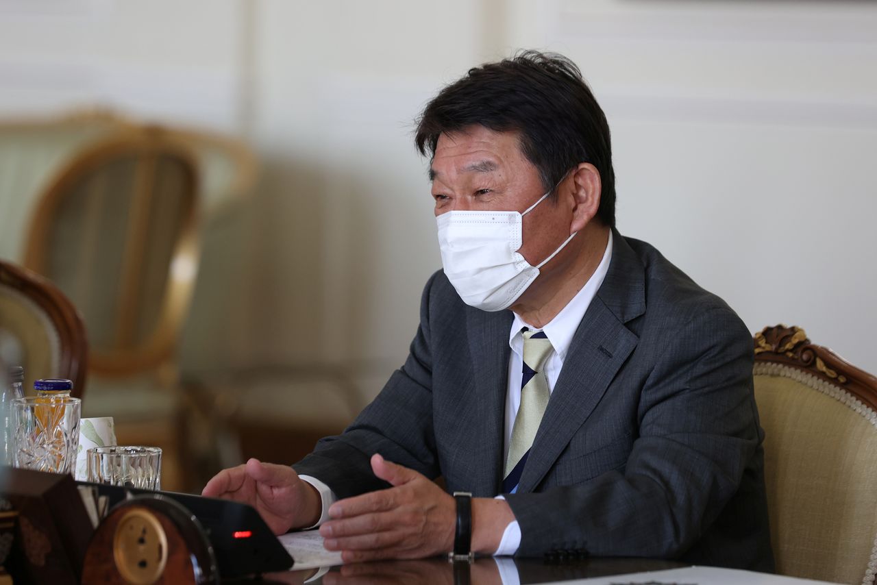 Japanese Foreign Minister Toshimitsu Motegi meets with his Iranian counterpart Mohammad Javad Zarif (not pictured) in Tehran, Iran August 22, 2021. Majid Asgaripour/WANA (West Asia News Agency) via REUTERS/Files