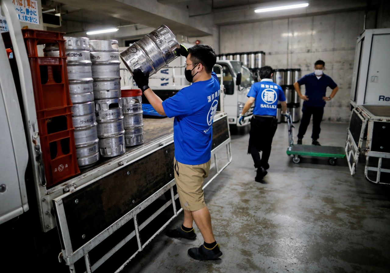 FILE PHOTO: Employees of Sasaki Saketen, a liquor wholesaler company, engages in shipping work of beer barrels as Japanese government is expected to lift state of emergency in all regions, amid the coronavirus disease (COVID-19) pandemic, in Tokyo, Japan September 28, 2021. REUTERS/Issei Kato/File Photo