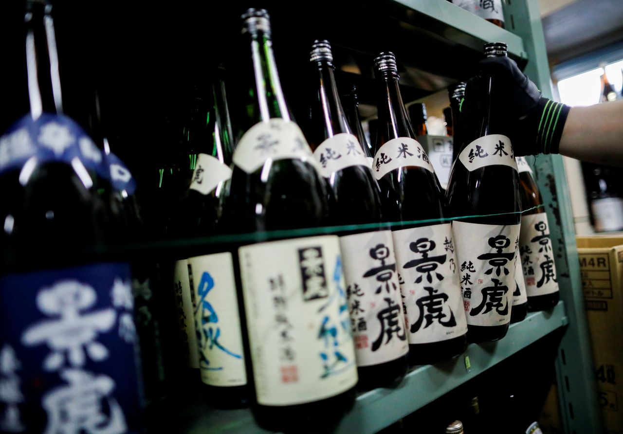 FILE PHOTO: An employee of Sasaki Saketen, a liquor wholesaler company, engages in shipping work of sake bottles as the Japanese government is expected to lift state of emergency in all regions, amid the coronavirus disease (COVID-19) pandemic, in Tokyo, Japan September 28, 2021. REUTERS/Issei Kato/File Photo