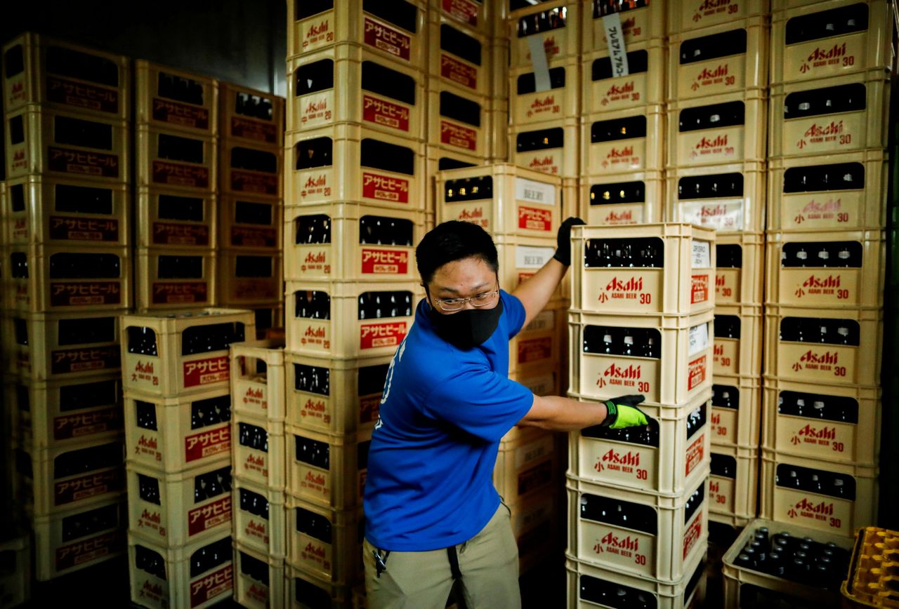 FILE PHOTO: An employee of Sasaki Saketen, a liquor wholesaler company, engages in shipping work of beers as Japanese government is expected to lift state of emergency in all regions, amid the coronavirus disease (COVID-19) pandemic, in Tokyo, Japan September 28, 2021. REUTERS/Issei Kato/File Photo