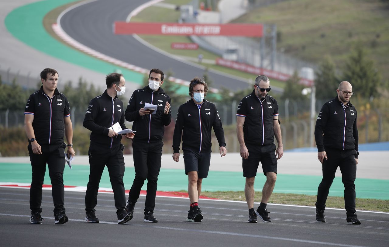 Formula One F1 - Turkish Grand Prix - Intercity Istanbul Park, Istanbul, Turkey - October 7, 2021 Alpine's Fernando Alonso with team members ahead of the Turkish Grand Prix REUTERS/Murad Sezer