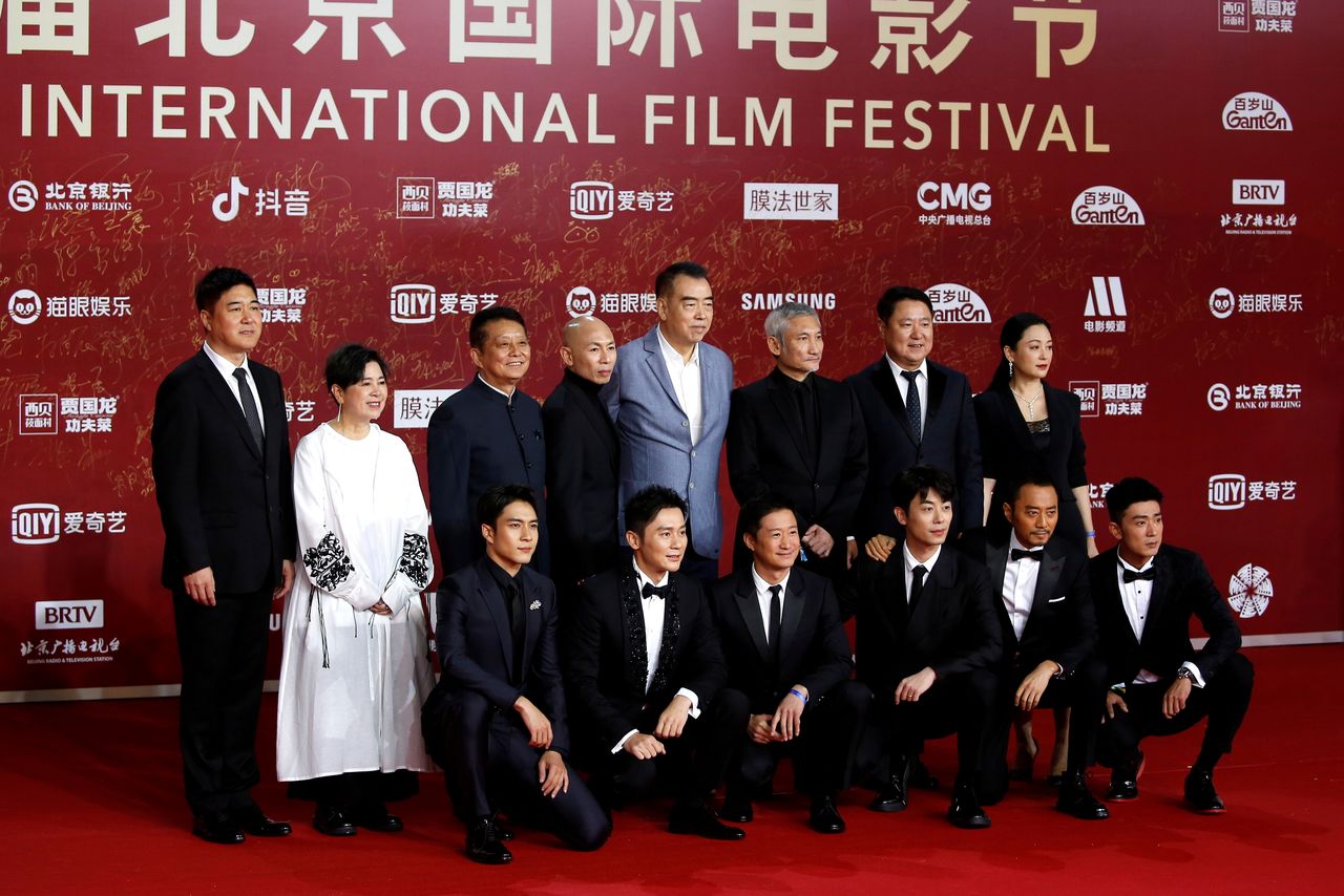 FILE PHOTO: Directors Chen Kaige, Dante Lam and Tsui Hark pose for photos with crew members of the film "The Battle at Lake Changjin", during a red carpet ceremony at the Beijing International Film Festival, in Beijing, China September 20, 2021. REUTERS/Tingshu Wang