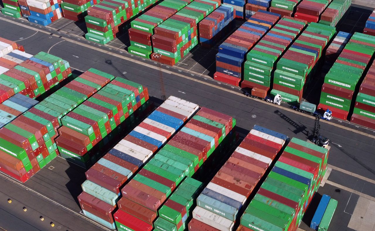 A view shows stacked shipping containers at the port of Felixstowe, Britain, October 13, 2021. REUTERS/Hannah McKay