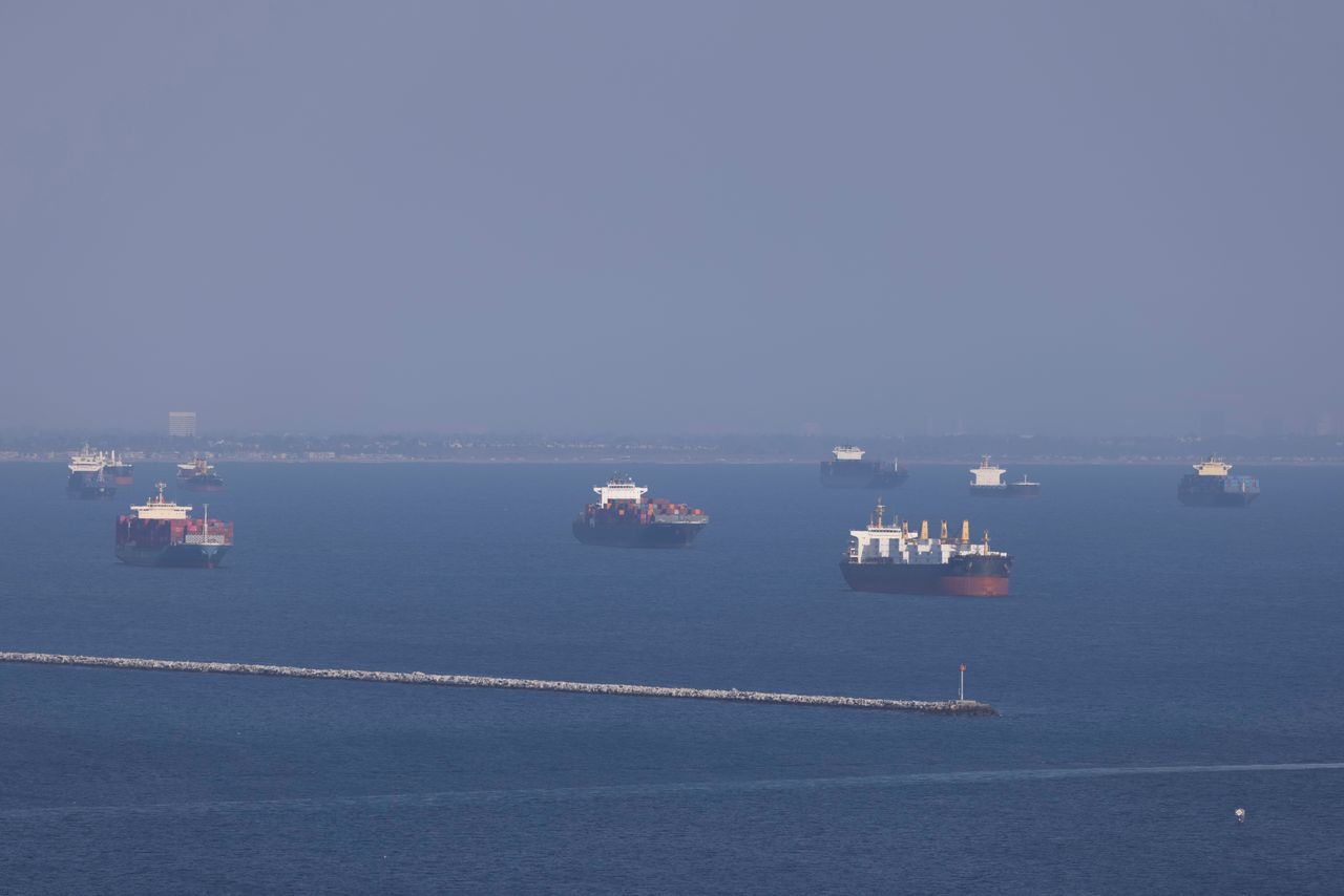 Container ships wait off the coast of the congested ports of Los Angeles and Long Beach, in Long Beach, California, September 29, 2021. REUTERS/Mike Blake