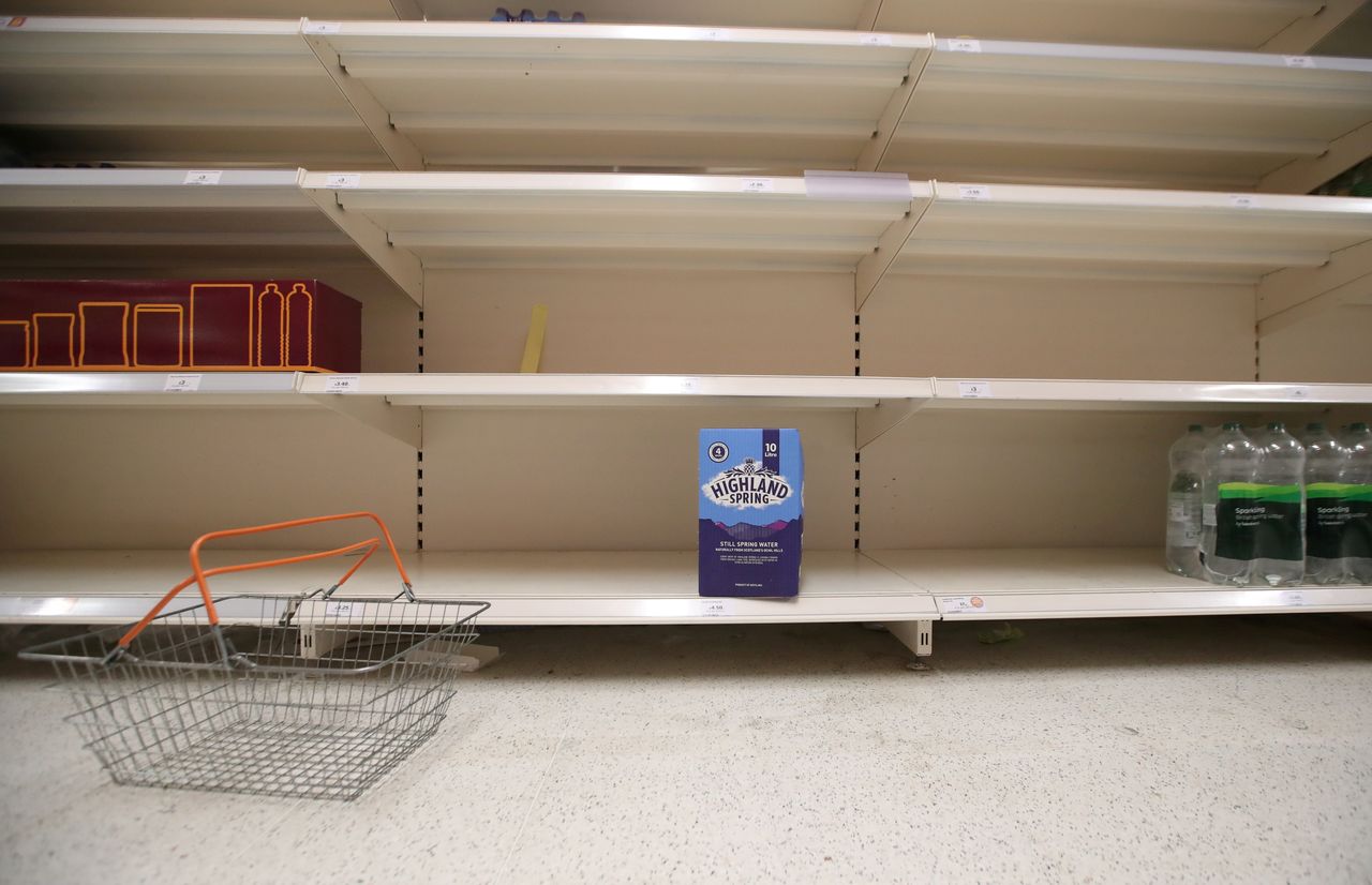 A shopping basket is discarded next to empty shelves of the soft drinks aisle, in Sainsbury's supermarket in Harpenden, Britain, September 22, 2021. REUTERS/Peter Cziborra