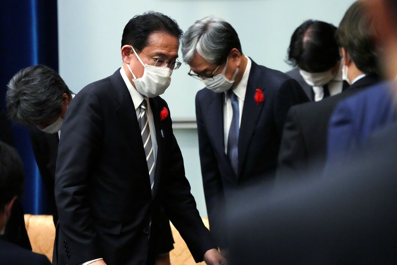 FILE PHOTO: Japanese Prime Minister Fumio Kishida leaves a news conference at the prime minister's official residence in Tokyo, Japan October 14, 2021. Eugene Hoshiko/Pool via REUTERS