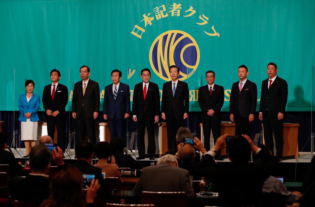 Leaders of Japan's main political parties the Social Democratic Party head Mizuho Fukushima, the Democratic Party for the People leader Yuichiro Tamaki, the Japanese Communist Party Chairman Kazuo Shii, the Constitutional Democratic Party of Japan leader Yukio Edano, Japan’s Prime Minister and ruling Liberal Democratic Party President Fumio Kishida, Komeito party leader Natsuo Yamaguchi, The Japan Restoration Party, also known as the Japan Restoration Association, leader Ichiro Matsui, Reiwa Shinsengumi party leader Taro Yamamoto and leader of the party fighting against NHK in the trial for violating Article 72 of the Attorney Act Takashi Tachibana attend a debate session ahead of October 31, 2021 lower house election, at the Japan National Press Club in Tokyo, Japan October 18 , 2021. REUTERS/Issei Kato/Pool
