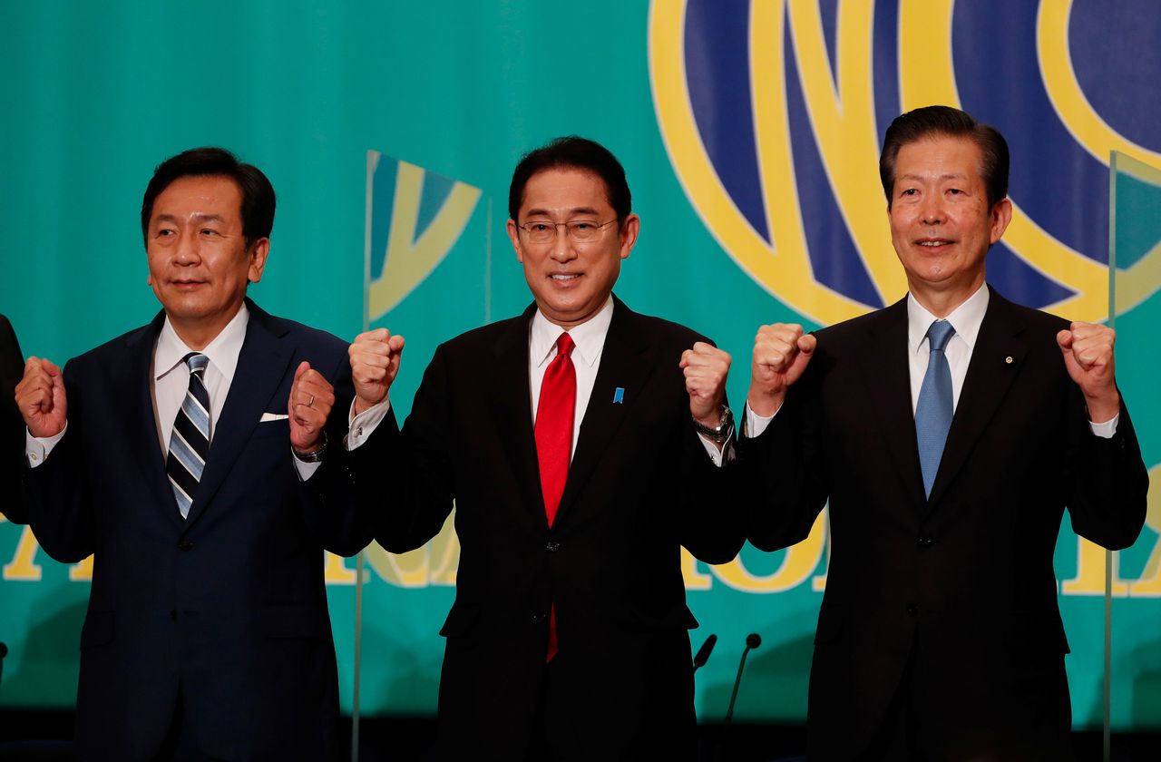 Leaders of Japan's main political parties, the Constitutional Democratic Party of Japan leader Yukio Edano, Prime Minister and ruling Liberal Democratic Party President Fumio Kishida, Komeito party leader Natsuo Yamaguchi and other leaders attend a debate session ahead of October 31, 2021 lower house election, at the Japan National Press Club in Tokyo, Japan October 18 , 2021. REUTERS/Issei Kato/Pool
