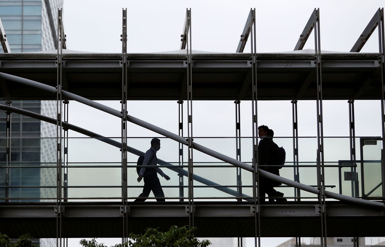 FILE PHOTO: Businessmen wearing protective face masks walk on a pedestrian bridge, amid the spread of the coronavirus disease (COVID-19), in a business district in Tokyo, Japan June 24, 2020. REUTERS/Issei Kato