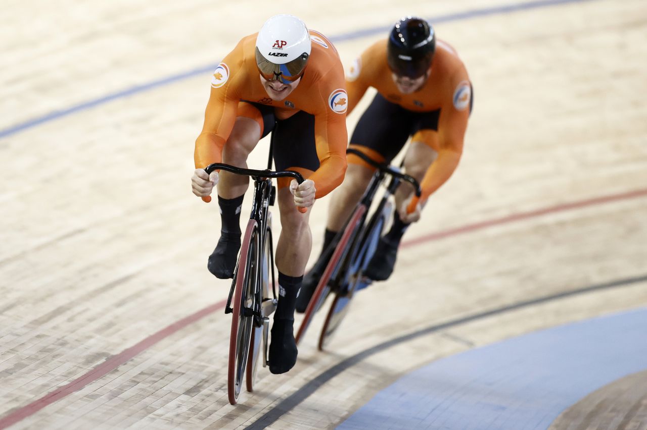 Cycling - UCI Track Cycling World Championships - Stab Velodrome, Roubaix, France - October 24, 2021 Netherlands' Harrie Lavreysen and Jeffrey Hoogland in action during the men's sprint final for gold REUTERS/Christian Hartmann