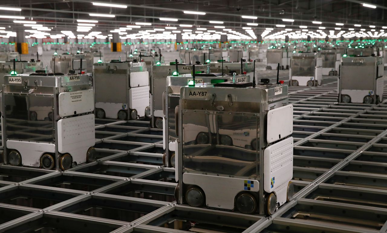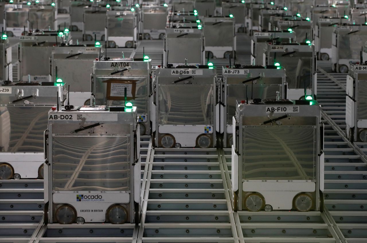 At its largest site, the $310 million building in Erith, southeast London, more than 2,000 robots whizz around the steel and aluminium grid covering four metres a second, replacing the humans who once retrieved groceries.