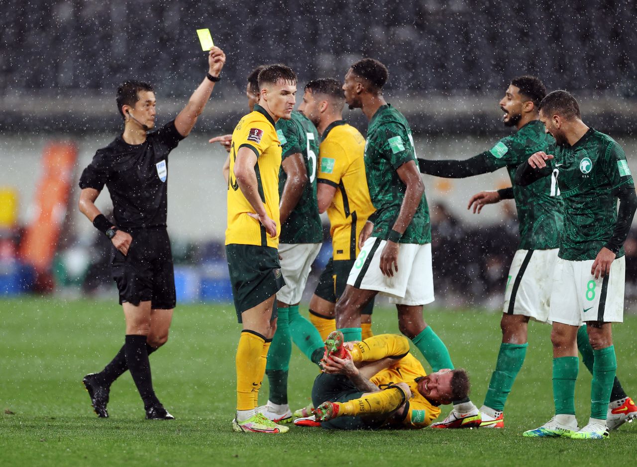 Soccer Football - World Cup - Asian Qualifiers - Group B - Australia v Saudi Arabia - Western Sydney Stadium, Sydney, Australia - November 11, 2021 Saudi Arabia's Ali Hadi Albulayhi is shown a yellow card by referee Ko Hyung-jin as Australia's Martin Boyle reacts after sustaining an injury REUTERS/Loren Elliott