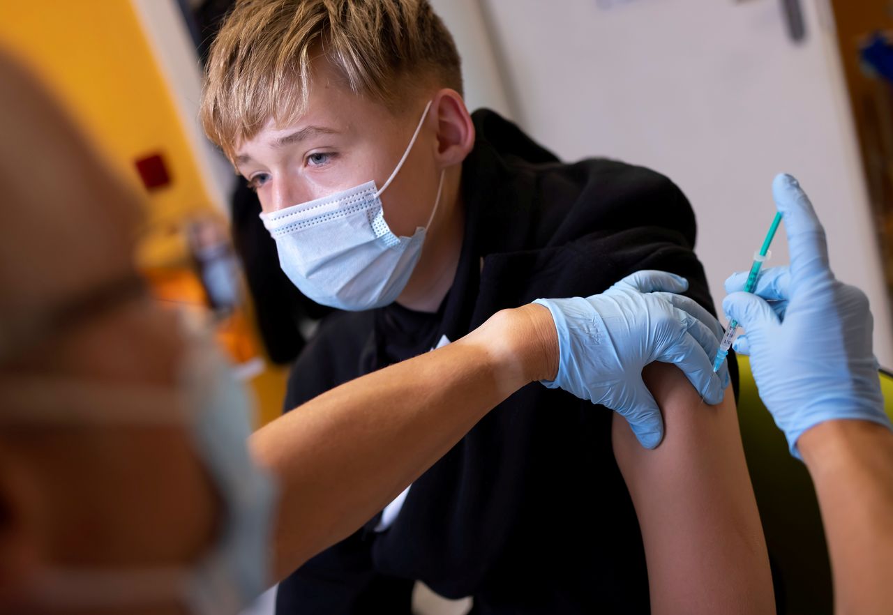 FILE PHOTO: A doctor vaccinates a 13-year-old boy with a coronavirus disease (COVID-19) vaccine, in his doctor's office in Berlin, Germany, November 2, 2021. REUTERS/Hannibal Hanschke