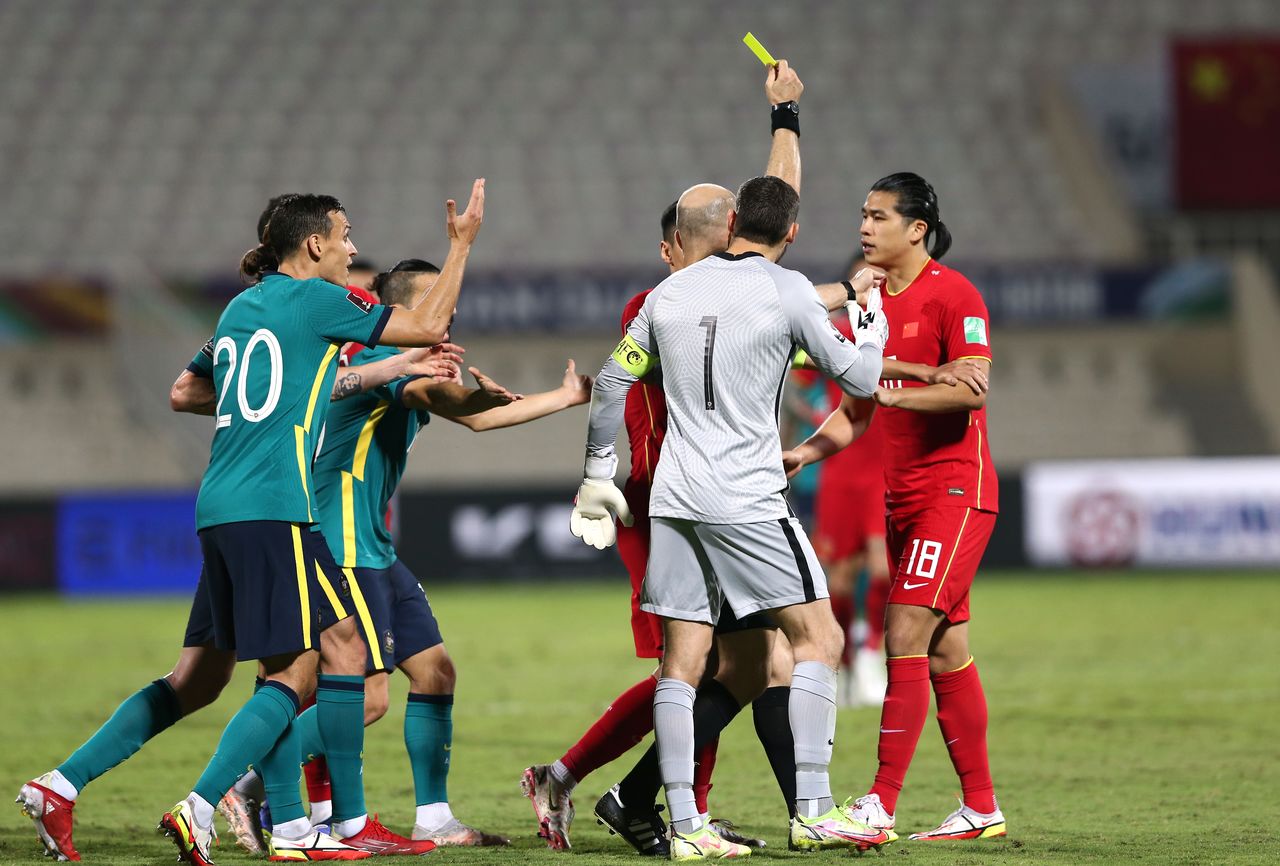 Soccer Football - World Cup - Asian Qualifiers - Third Round - Group B - China v Australia - Sharjah Stadium, Sharjah, United Arab Emirates - November 16, 2021 China's Yu'Ning Zhang is shown a yellow card by referee Adham Makhadmeh REUTERS/Satish Kumar