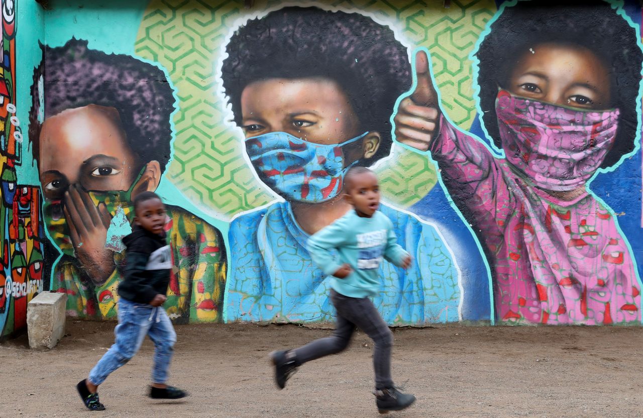FILE PHOTO: Boys run past a mural by Senzart911, of children wearing facemasks amid the coronavirus disease (COVID-19) outbreak, at Soweto's Kliptown, South Africa, October 27, 2021. REUTERS/Siphiwe Sibeko