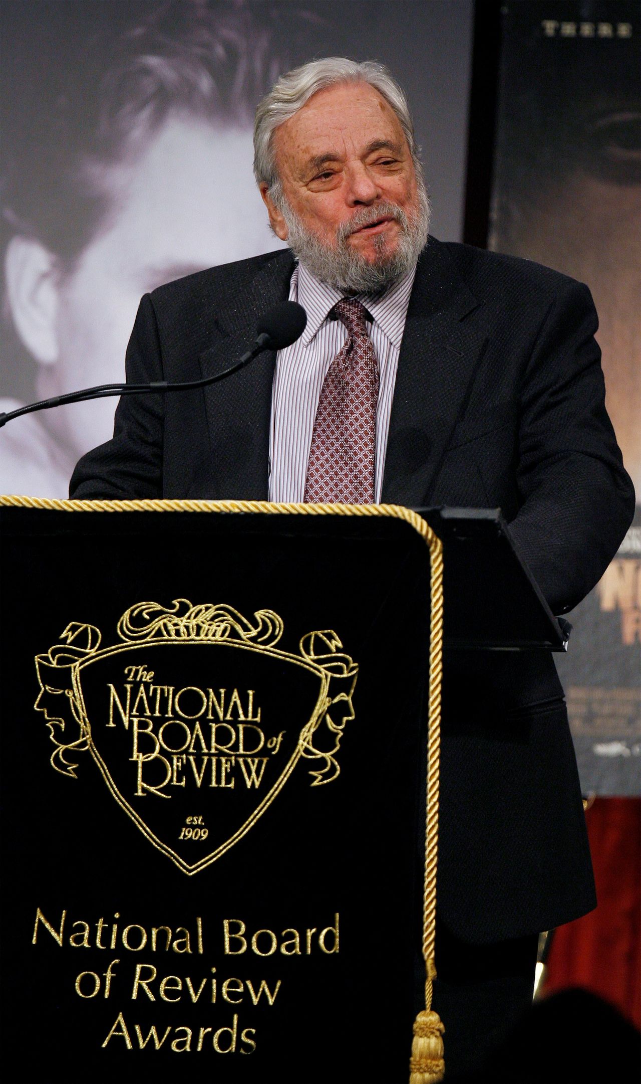 FILE PHOTO: Writer Stephen Sondheim presents an award for Best Director during the National Board Of Review of Motion Pictures award gala in New York January 15, 2008. REUTERS/Lucas Jackson