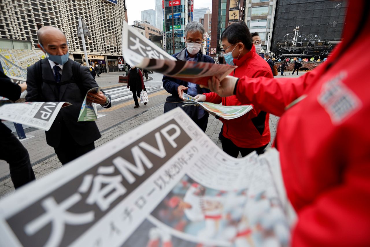 FILE PHOTO: People receive extra editions of a newspaper, reporting Japan's Shohei Ohtani of the Los Angeles Angels was named Most Valuable Player of Major League Baseball's American League, in Tokyo, Japan Japan November 19, 2021. REUTERS/Issei Kato