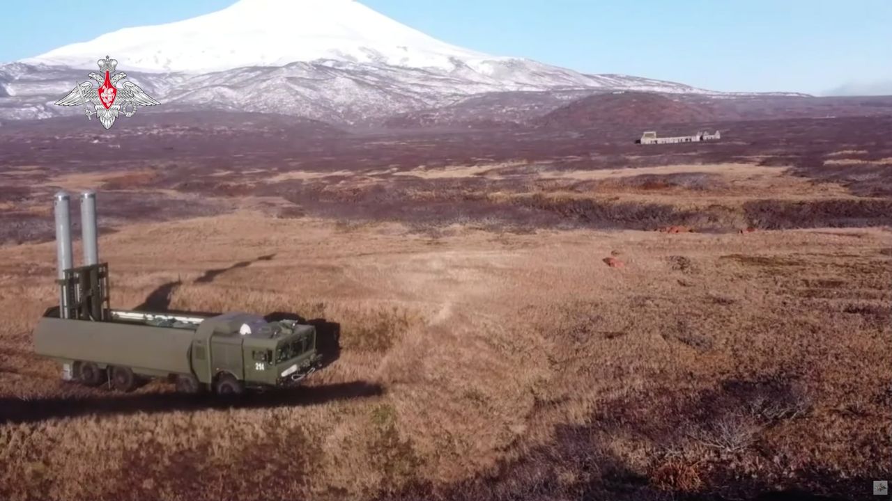 A carrier of Russia's Bastion coastal missile defence system is seen on the remote Matua island, which is part the Kuril island chain also known as the Northern Territories in Japan, in the Pacific, in this still image taken from video released by the Russian Defence Ministry December 2, 2021. Russian Defence Ministry/Handout via REUTERS