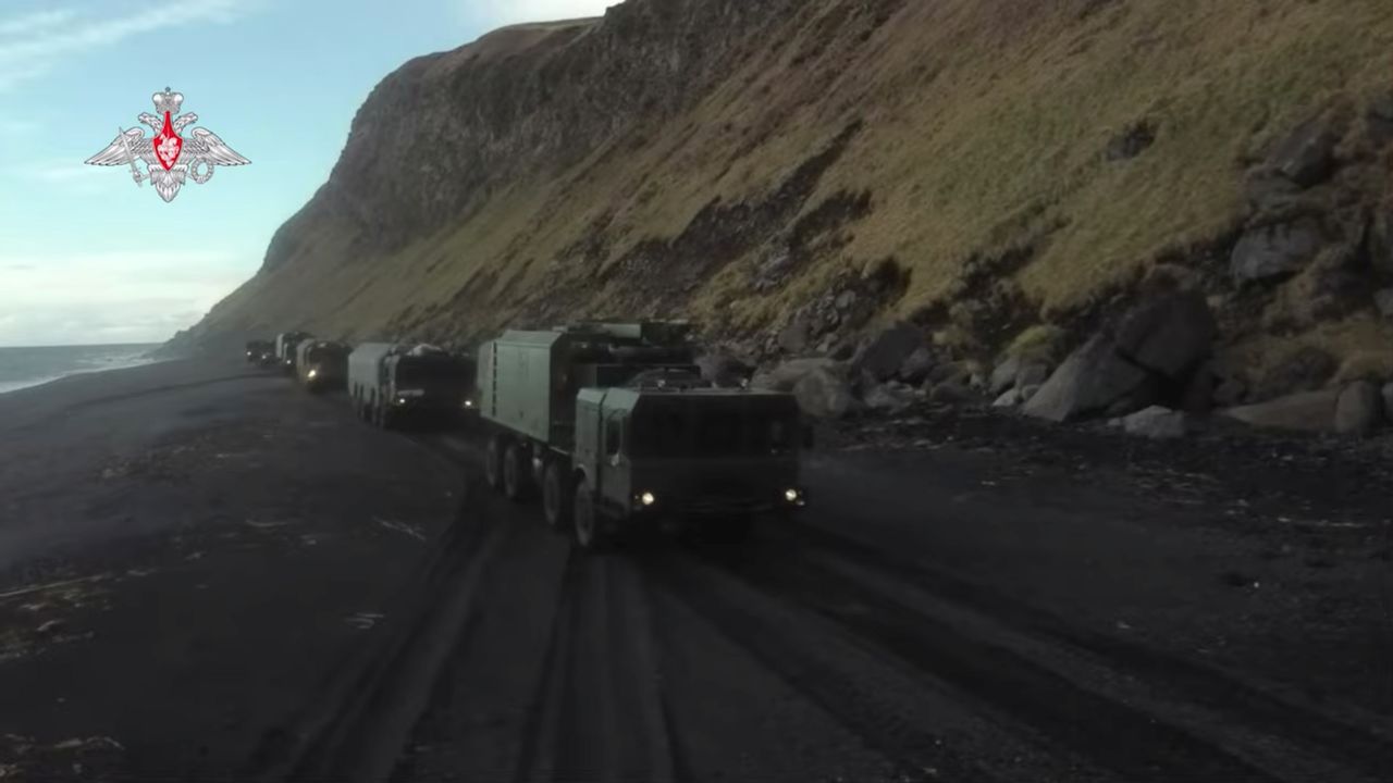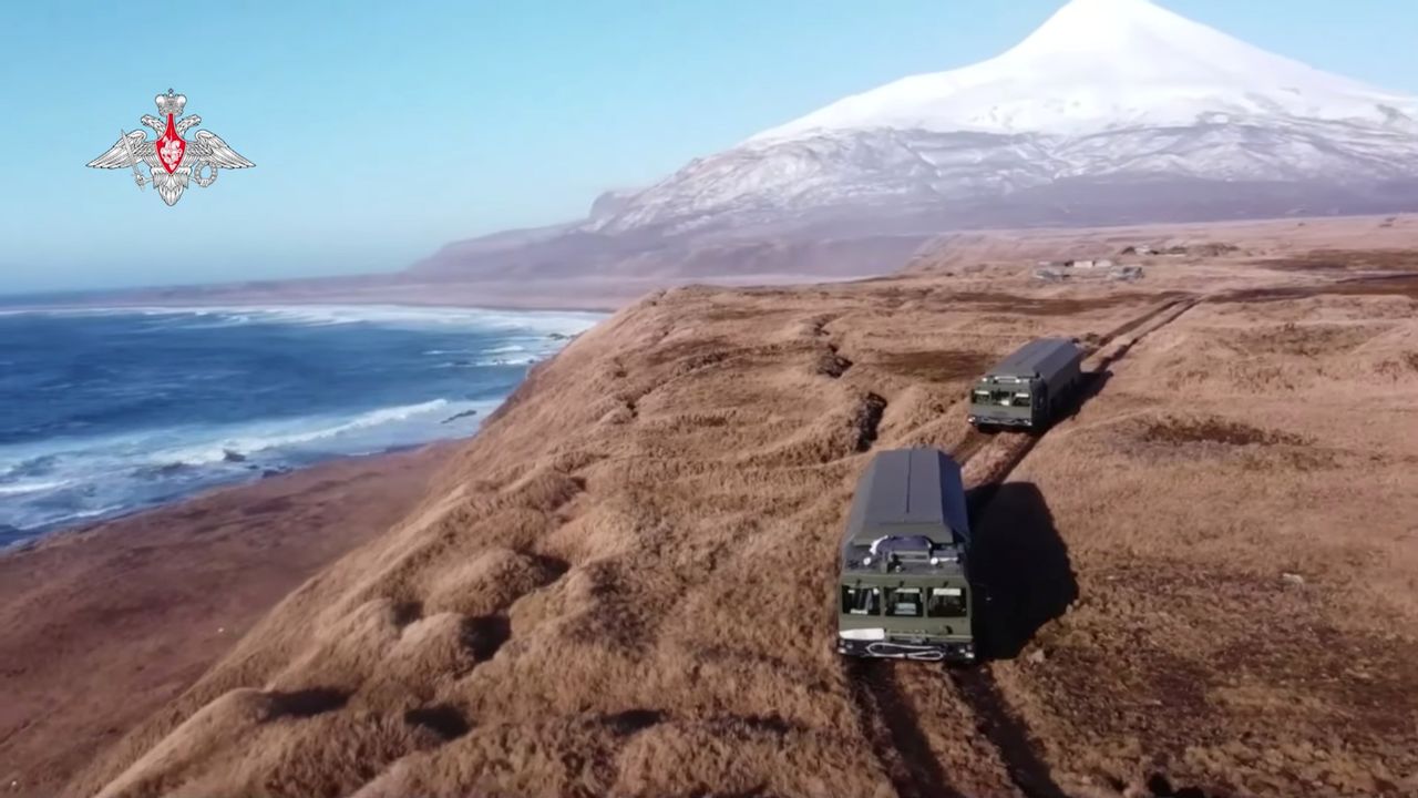 Russia's carriers of the Bastion coastal missile defence system drive on the remote Matua island, which is part the Kuril island chain also known as the Northern Territories in Japan, in the Pacific, in this still image taken from video released by the Russian Defence Ministry December 2, 2021. Russian Defence Ministry/Handout via REUTERS